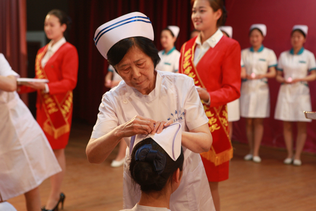授帽仪式在优美、庄重的乐曲声中开始。象征着传递火种的女神手提火种台灯款款走上舞台,薛松梅教授走上台引燃火种点燃烛台。实习生代表身着洁白的护士服,依次缓缓走入会场,单膝跪地,虔诚地迎接着这一神圣时刻的到来。护理学院老师薛松梅、曹谨玲、郭兰青、张金华、杨磊满怀深情与期待地为她们戴上圣洁的燕尾帽,把象征南丁格尔“燃烧自己,照亮别人”精神的火种传递到下一代护理人手中,实习生代表深深地一跪,象征着南丁格尔后裔对老一辈的敬重,象征着新一代护士对护理事业的向往。洁白的燕尾帽,体现出护士向上的志气,洁白的护士服,象征着护士纯洁的心灵。随后护理学院老师王静带领全场护理人员在南丁格尔画像前庄严宣誓,一句句掷地有声的南丁格尔誓言在烛光中荡漾,回荡在上空,萦绕在现场每一个人心中,激励学生为护理事业终身奋斗。